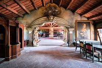 Dit is een foto van een prachtig verlaten restaurant dat volstaat met geweldige schilderijen en beelden. Er is ook een grote wandschildering van het Laatste Avondmaal te vinden.