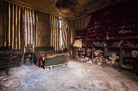 Dit is een foto van een prachtige slaapkamer in een verlaten kasteel. De slaapkamer, en andere ruimtes, staan nog vol antieke meubelen. Het kasteel stamt uit de 18e eeuw en is bijna 30 jaar verlaten.