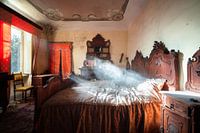 Gelegen op een groot verlaten industrieel terrein, heeft deze prachtige villa al een tijdje de tand des tijds doorstaan. Mooie antieke meubels zijn nog steeds intact. Stof bedekt de vloeren en objecten in de kamers. Dit is een foto die ik in de hoofd slaapkamer heb genomen.