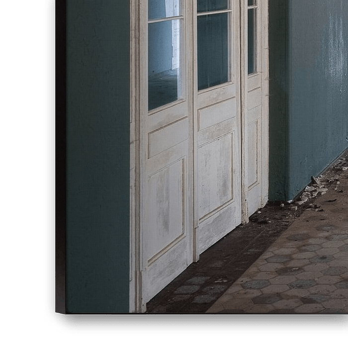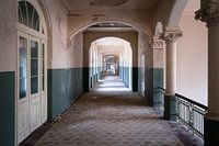 Dit is een foto van een van de vele lange gangen in een verlaten sanatoriumcomplex.