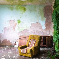 Dit is een foto van een verlaten stoel en kastje die in een kamer staan van een voormalig verzorgingstehuis. Het verzorgingstehuis staat zo goed als leeg. Aan de muur groeien planten en er is veel schimmel in het pand.
