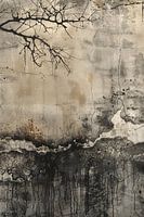 Verweerde muur met diepe barsten en een ruwe, bijna desolate uitstraling. In het bovenste gedeelte van het werk strekt een enkele, donkere tak zich uit, zijn kale, kronkelige vormen contrasteren scherp met de licht gekleurde, gebarsten muur op de achtergrond. De tak lijkt bijna uit de muur te groeien, wat een gevoel van eenzaamheid en verval oproept. De muur zelf is getextureerd met vlekken, scheuren en afbladderende verf, wat een gevoel van verwaarlozing en tijdsverloop benadrukt.