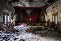 Dit is een foto van een mooi, maar donker, verlaten theater in Italië. De rode gordijnen bij het podium trekken de aandacht, terwijl de muur schilderingen boven de deur en het raam aan de rechterkant ook interessant om te zien zijn. Het theater ligt er al vele jaren verlaten bij.