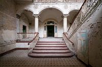 Dit is een foto van een prachtige trap in de ingang van een verlaten sanatorium in Beelitz, Duitsland.