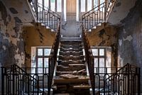 Dit is een foto van een trap in een van de gebouwen van een verlaten sanatoriumcomplex. De bouw van het complex begon in de jaren '30 van de 20e eeuw. In de jaren 60 werd het complex gesloten nadat de behandeling van tuberculose veel effectiever was geworden met penicilline. Sindsdien zijn de gebouwen verlaten en vervallen. Vanwege de regels van het architecturale erfgoed is elk project of elke verkoop om aan het complex te gaan werken gesloten.