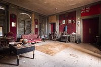 Dit is een foto van een woonkamer in een verlaten kasteel. De kamer, en ook de meeste kamers van de rest van het gebouw, staan nog vol antieke meubelen en spullen. Prachtig om te zien. Het huis is van een voormalig verzamelaar van spullen die met de oorlog te maken hebben.