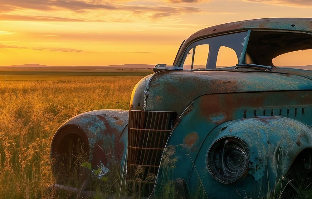 Verlaten auto bij zonsondergang