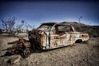 Een verlaten roestige Amerikaanse auto in de spookstad Rhyolite in de woestijn van Nevada USA op een zonnige dag