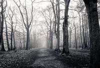 Zwart-wit foto van een verlaten bos in de mist. Ik heb deze foto gemaakt op een koude winterochtend op landgoed Visdonk in het Brabantse Roosendaal.