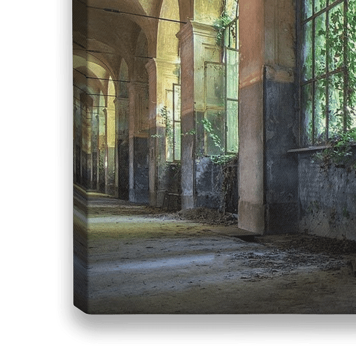 Lange gangen met hoge gewelven in voormalige inrichting in Italie. Het gebouw staat prominent in het centrum maar raakt door leegstand en het ontbreken van onderhoud tot aal in verval. Italiaanse gebouwen zijn ontworpen op het Italiaanse vaak warme klimaat. Het resulteert in mooie overdekte galerijen en prachtige koele groene patio's.