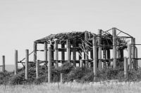 Geraamte van een urbex tabaksfabriek waar voorheen tabak werd gedroogd en geproduceerd. Deze ruïne vormt een opvallend contrast met het omringende natuurgebied, Nationaal park Monfrague, Trujillo, Extremadura, Spanje. Dit gebied is aantrekkelijk voor vogelaars, omdat er veel roofvogels te spotten zijn.