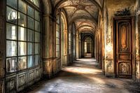 Deze afbeelding toont een betoverende, verlaten gang in een oud Italiaans paleis. De sfeer is mysterieus, met afbladderende verf en versleten vloeren die de tand des tijds laten zien. De hoge ramen, verlicht door zachte lichtstralen, geven de ruimte een nostalgische en tijdloze charme. Het ontwerp ademt de grandeur van vervlogen tijden, en brengt een gevoel van rust en melancholie met zich mee. Perfect voor liefhebbers van klassieke architectuur en het mystieke van verlaten locaties, deze afbeelding brengt een unieke combinatie van historie en visuele poëzie in elk interieur.