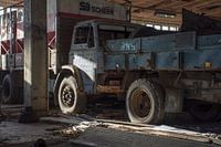 In deze verlaten garage staat het nog vol met inmiddels antieke auto's en vrachtwagens. Deze auto's hebben al heel wat jaren geen daglicht meer gezien.