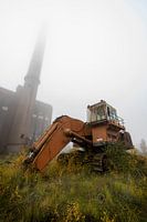 Verlaten graafmachine en fabriek met mist van Steven Dijkshoorn