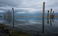 Een verstild moment vastgelegd bij het oude landbouwhaventje “De Oesterput” op Noord-Beveland. Vanuit een laag standpunt in de hoek van het haventje ontvouwt zich een symmetrisch lijnenspel van verweerde houten palen die aan weerszijden weglopen in de verte. Het wateroppervlak in de voorgrond is spiegelglad door de vloed, waardoor de onderliggende basaltkeien subtiel zichtbaar worden. De dreigende lucht op de achtergrond, donker en zwaar van regen, reflecteert in het water en versterkt de sfeer van verlatenheid en stilte. Deze foto vangt niet alleen een landschap, maar ook een gevoel van tijdloosheid en de kracht van vergankelijkheid. Een ode aan de Zeeuwse rust, waar natuur en geschiedenis elkaar raken.