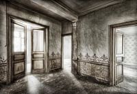 Verlaten, vervallen huis met open staande deuren en invallend licht