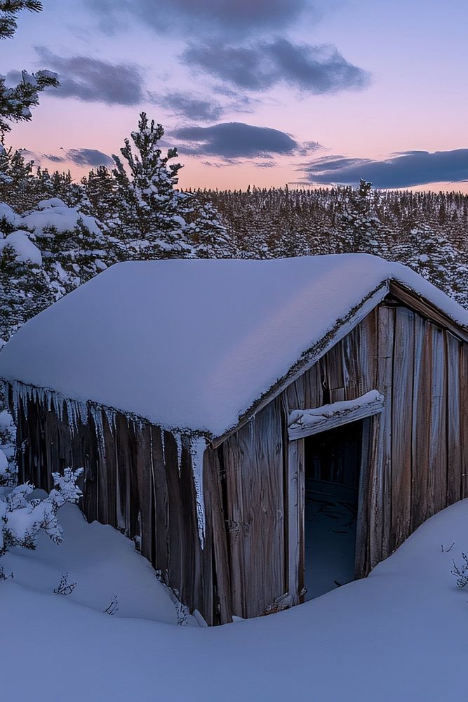 Dit sfeervolle ontwerp toont een verlaten houten hut, verborgen in een prachtig winterlandschap. Het beeld straalt een serene rust uit met de ondergaande zon die een zachte roze gloed aan de hemel werpt. Omringd door besneeuwde bomen en struiken, lijkt de hut eenzaam te wachten in de stilte van het bos. De dikke laag sneeuw op het dak en de bevroren grond benadrukken de koude, rustige sfeer. Dit beeld is perfect voor iedereen die de serene schoonheid van winterlandschappen waardeert en geeft elke ruimte een vleugje natuurlijke rust.