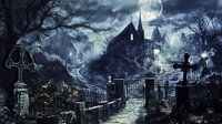 Koop dit digital art kunstwerk Verlaten kerkhof in de avond van Frank Heinz als reproductie op canvas, aluminium dibond, (ingelijste) fotoprint, behang en ArtFrame, op maat geprint in Fine-Art kwaliteit.