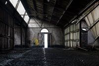 Vervallen interieur van een loods in de haven van Antwerpen, met een prachtige lichtval en mooi vermolmde houten wanden en kasseien op de grond.