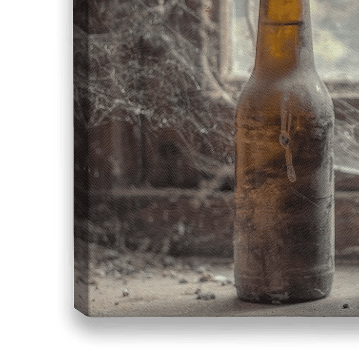 Koop de foto Verlaten plaats - bier met spinnenwebben van Carina Buchspies op canvas, aluminium dibond, (ingelijste) fotoprint, behang en ArtFrame, op maat geprint in Fine-Art kwaliteit.