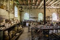 Een kijkje binnenin een verlaten pottenbakkerij. Met allerlei attributen en achtergelaten aardewerk.