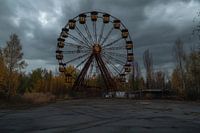 Dit mysterieuze en spookachtige ontwerp toont een verlaten reuzenrad dat stil en vergeten in een desolate omgeving staat. Het rad, met zijn roestige structuur en verweerde zitjes, geeft een gevoel van verlatenheid en tijdsverloop. De dreigende, bewolkte lucht en de omringende bomen in herfstkleuren versterken het sombere karakter van de foto. Het roept gevoelens op van vergankelijkheid en de melancholie van een vervlogen tijdperk. Perfect voor liefhebbers van industriële en verlaten architectuur, past dit beeld goed in een rustige en minimalistische inrichting om een subtiele, nostalgische sfeer toe te voegen.