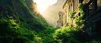 Verborgen schoonheid bloeit op tussen vervallen muren en weelderig groen, terwijl de zon zachtjes opkomt achter de berg. Mystiek en natuur komen samen in een harmonieus geheel dat je uitnodigt om te dromen. Ideaal ingericht in de woonkamer, creëert het een kalme, inspirerende sfeer die je aanmoedigt om te blijven hangen.
