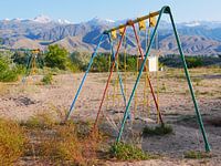 Verlaten speeltuin in Kirgizië met bergen op de achtergrond