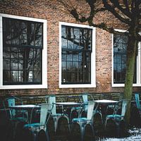 De reflecties in de ramen de oude boom en de sneeuw op de tafels geeft een eenzaam straatbeeld.
