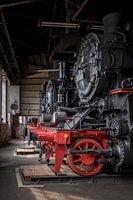 Een stoomlocomotief in een oude Duitse trein remise in Chemnitz. De remise is als museum opgesteld voor bezoekers.