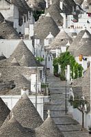 Verlaten straat slingerend tussen de traditionele witte trulli huizen met de puntdaken op de vroege ochtend in de stad Alberobello, Apulië, Zuid-Italië.