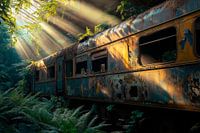 Koop de foto Verlaten trein in het licht van de jungle van Poster Art Shop op canvas, aluminium dibond, (ingelijste) fotoprint, behang en ArtFrame, op maat geprint in Fine-Art kwaliteit.