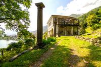 Een statige maar vervallen villa, verborgen in het groen met uitzicht over een glinsterend meer. De verweerde muren en de eenzame zuil vertellen verhalen van een vervlogen tijd vol grandeur. Het zachte zonlicht en de weelderige natuur geven de plek een bijna dromerige sfeer – een magisch contrast tussen vergankelijkheid en schoonheid.