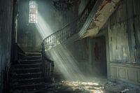 "Faded Splendour" is een indrukwekkend kunstwerk dat de sublieme schoonheid vastlegt van een verlaten villa waarvan de vroegere elegantie is verzacht door de sporen van de tijd. Lichtstralen breken door het gebroken plafond en verlichten de afbrokkelende trap en de stoffige, vergulde zuilen. Dit beeld verleent een bijna heilige kwaliteit aan de stilte en eenzaamheid van de ruimte en weerspiegelt de onvermijdelijke vergankelijkheid van zelfs de meest prachtige gebouwen. Deze foto is perfect voor liefhebbers van architectuur, geschiedenis en het mysterieuze en nodigt je uit om jezelf te verliezen in gedachten aan vervlogen tijden.