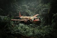 In de dichte jungle staat een oude vliegtuigromp verloren in de tijd. Oorspronkelijk gebouwd voor avontuur en snelheid, ligt het nu stil en bedekt met mos en lianen. De groene bladeren en klimplanten omarmen de metalen restanten, alsof ze het verleden willen verbergen. De zonnestralen breken door het dichte bladerdak en werpen een geheimzinnig licht op het verroeste vliegtuig. Dit stuk van vervlogen tijden lijkt een verhaal te vertellen van een vroeger leven, vol dromen en avonturen. Een bijzonder moment vastgelegd in de natuur, een herinnering aan hoe de tijd verdergaat en de natuur zijn eigen weg volgt. Perfect om te laten zien dat zelfs verloren voorwerpen nog steeds schoonheid en verhalen hebben.