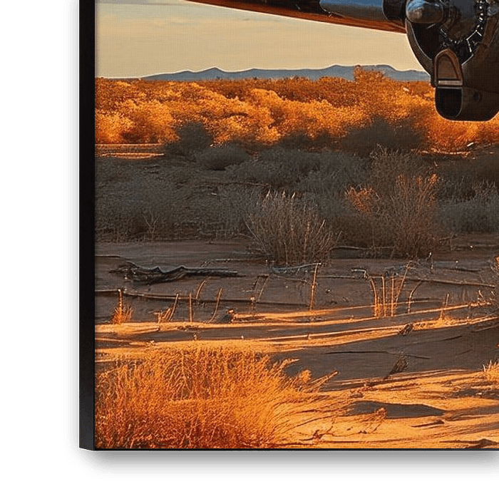 Een verlaten vliegtuig in de woestijn, gevangen in het warme licht van de ondergaande zon. De verweerde huid van het vliegtuig vertelt een verhaal van vroegere avonturen, nu tot stilstand gekomen in het zand. De lucht is dramatisch met wolken die verlicht zijn door de laatste zonnestralen, wat een gevoel van rust en eindigheid geeft. Het is een momentopname van vergeten glorie, waarbij het vliegtuig en de omgeving samensmelten tot een symbolisch beeld van de vergankelijkheid van menselijke prestaties.