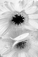 Het lijkt net of de Gerbera "kijkt" naar het blaadje die op een waterige reflectie ligt. (Een soort antropomorfisme: menselijke eigenschappen geven aan bloemen / planten)