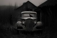 Een verlaten auto ligt vergeten te roesten in de open lucht, terwijl een eenzame raaf erop neerstrijkt, als bewaker van het verlatene. Samen vormen ze een griezelig tafereel - de natuur neemt terug wat is achtergelaten, een herinnering aan de loop van het leven en de stille schoonheid van verval.