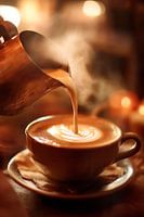 Een zachte stoom trekt verleidelijk uit een kopje, alsof het verhalen van gezelligheid en plezier vertelt. De zachte bruine en beige tinten geven het motief een uitnodigende warmte die perfect past in een keuken- of caféambiance. Hier nodigt elke slok je uit om te blijven hangen en te dromen.