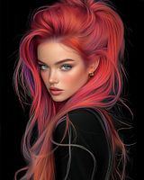 Dit werk toont een prachtige jonge vrouw met fel oranje-rood haar dat volumineus en golvend langs haar gezicht valt. Ze heeft een porseleinen huid, opvallend helderblauwe ogen en subtiele maar elegante make-up met een focus op haar volle lippen en gedefinieerde wenkbrauwen. Ze draagt kleine, gouden oorringen en haar expressie straalt zelfvertrouwen uit. Het dramatische contrast tussen haar opvallende haar en de donkere achtergrond versterkt haar uitstraling.