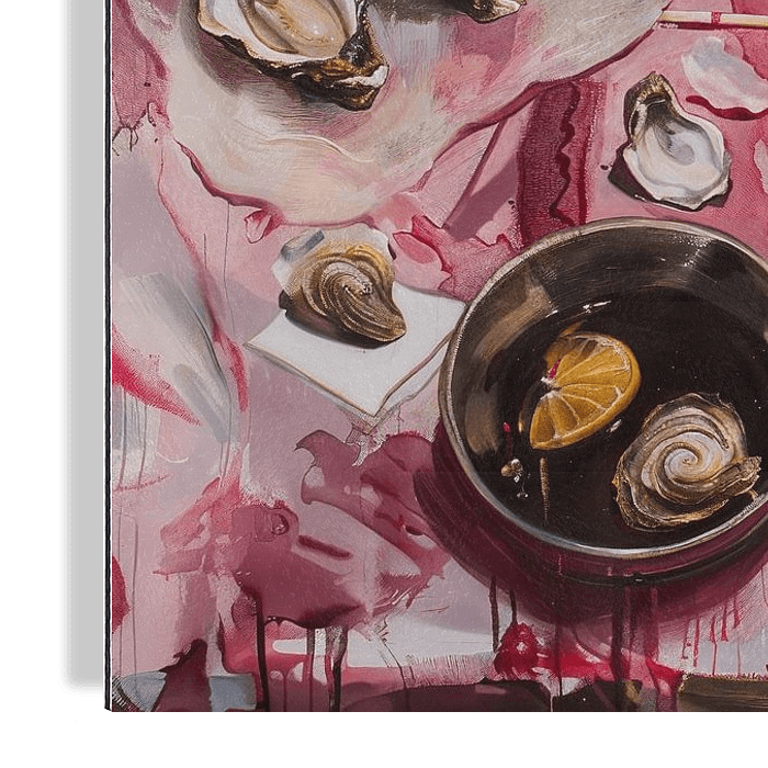 Dit prikkelende stilleven, vol symboliek en zintuiglijke verleiding, toont een elegant gedekte tafel vol oesters, citroenen en rode wijn, vastgelegd in een expressieve, bijna sensuele schilderstijl. De diepe tinten van het wijnrood druipen letterlijk over het roze tafellaken, alsof de emoties op het doek zijn uitgestort. De verf is op…