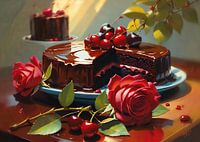 Verse taart gemaakt van pure Belgische chocolade met een topping van gesmolten cacaomassa en verse zongerijpte kersen uit Zuid Limburg. Heerlijk gepresenteerd met zoet geurende rozen in juni. Het geheel badend in het laatste streepje zonlicht ademt een sfeer van puur genot.