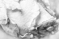 Verlepte roos, vergankelijkheid. Na een week ziet een roos, die niet goed tot bloei is gekomen, er zo uit. Verlept, maar toch prachtig. Omgezet naar zwart wit met een High Key bewerking.