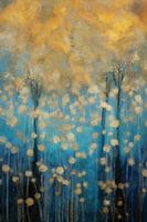 Dit werk toont een sfeervol bos waarin het licht op magische wijze door de bladeren schijnt. De goudgele tinten bovenin vloeien harmonieus over in de koelere blauwtinten onderaan, waardoor een dromerige, etherische sfeer ontstaat. De delicate, ronde vormen van de bladeren en bloemen creëren een speels effect, terwijl de hoge, slanke stammen een gevoel van diepte en mysterie toevoegen. Dit werk is ideaal voor wie houdt van de rustgevende schoonheid van de natuur en een vleugje magie in huis wil brengen.