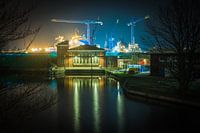 Verlicht gemaal Duurswold in Delfzijl bij nacht met scheepswerf Niestern Sander erachter. De moderne werfkranen geven een mooi contrast met het oude gemaal.