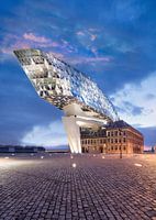 Verlichte Antwerpse Havenhuis bij schemering met de verharde Zaha Hadid vierkant op de voorgrond