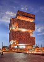 Koop de foto Verlichte MAS Museum bij schemer met geplaveide straat, Antwerpen 1 van Tony Vingerhoets op canvas, aluminium dibond, (ingelijste) fotoprint, behang en ArtFrame, op maat geprint in Fine-Art kwaliteit.