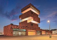 Koop de foto Verlichte MAS Museum bij schemer met geplaveide straat, Antwerpen 2 van Tony Vingerhoets op canvas, aluminium dibond, (ingelijste) fotoprint, behang en ArtFrame, op maat geprint in Fine-Art kwaliteit.