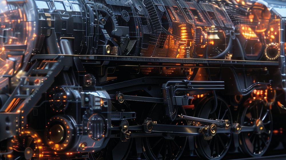 De helder verlichte onderdelen binnen de locomotief creëren een betoverend schouwspel van licht en schaduw, wat de technische schoonheid en functionaliteit van het ontwerp benadrukt. Elk element, van de grote wielen tot de kleinste schroeven, is zichtbaar en zorgvuldig weergegeven, waardoor een gevoel van beweging en kracht ontstaat. Dit kunstwerk is een perfecte fusie van klassieke elegantie en moderne technische precisie.