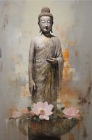 Dit adembenemende digitale schilderij toont een serene Boeddha, die de rust en verlichting symboliseert die velen zoeken in hun spirituele reis. De gedetailleerde uitstraling van de Boeddha, tegen de wazige achtergrond van pastelkleurige tinten, brengt een dromerige en meditatieve sfeer over. Opvallend in zijn hand is een delicate lotusbloem, die in veel oosterse culturen wordt beschouwd als een symbool van zuiverheid, verlichting en wedergeboorte. Het feit dat Boeddha de bloem zo zorgvuldig vasthoudt, suggereert een diepe connectie en respect voor de natuur en het leven zelf.